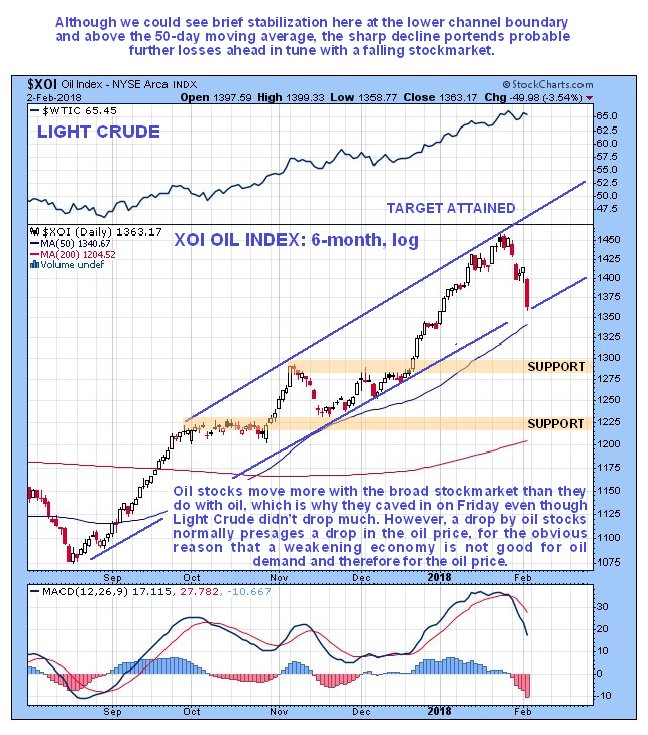 Thus we can see that “the writing is on the wall” already for oil which can be expected to break down from its uptrend in force from last July to enter a prolonged and potentially severe downtrend. As you are already aware, we have been looking for oil to go into reverse for some weeks now, and now it has the perfect excuse, a falling stockmarket, and the drop by oil stocks in sympathy with the drop in stocks generally on Friday portends a downtrend in oil.