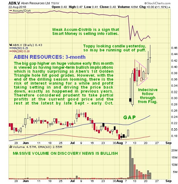 Aben Resources Ltd, ABN.V, ABNAF on OTC, closed at C$0.43, $0.33 on 22nd August 18.
