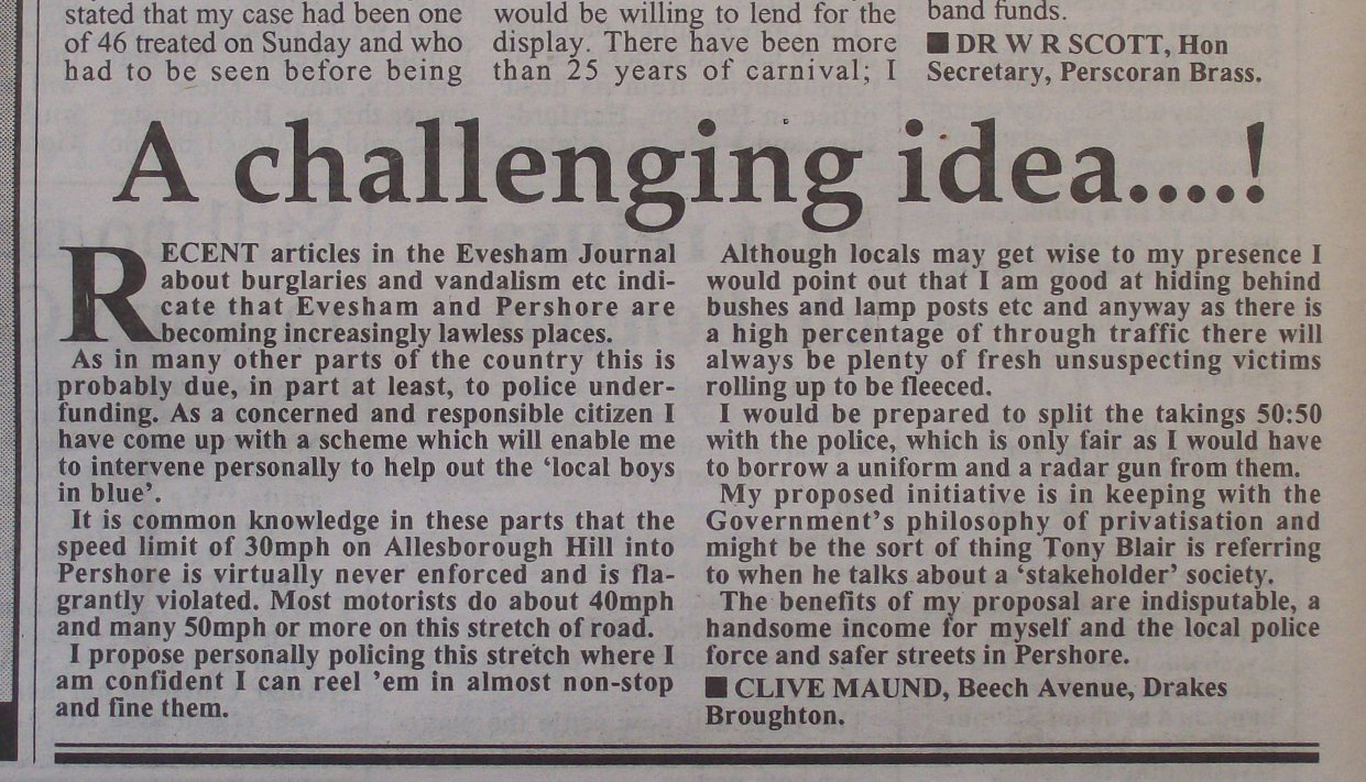 Lastly, I became increasingly aware that a lot of motorists were speeding on the wide approach road into Pershore and not just speeding but going really fast, doing 50 – 60 mph and sometimes more in a 30 limit and that nothing was being done about it – the police were ignoring it, a situation which clearly called for me to put pen to paper again. So I wrote the following letter to the local paper which requires no explanation…