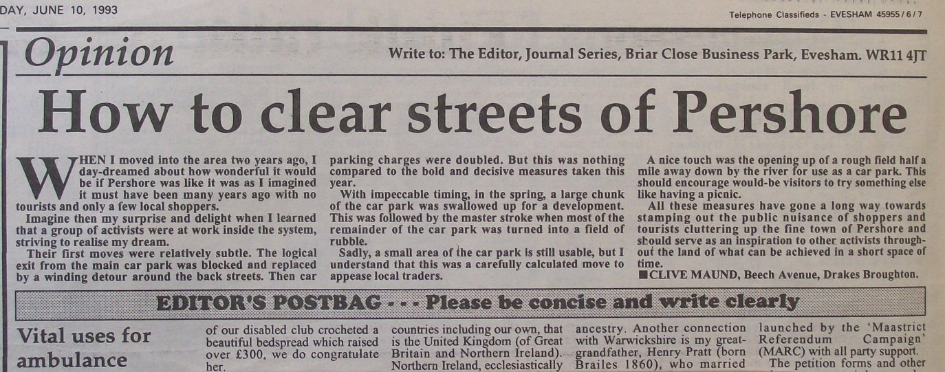This mail apparently had quite an impact for a few days later I was contacted by the Pershore Chamber of Commerce who congratulated me on it and told me that when it was read out at their meeting they fell about laughing and they then used it to subject the local council to ridicule, thus shaming them into doing something about it.