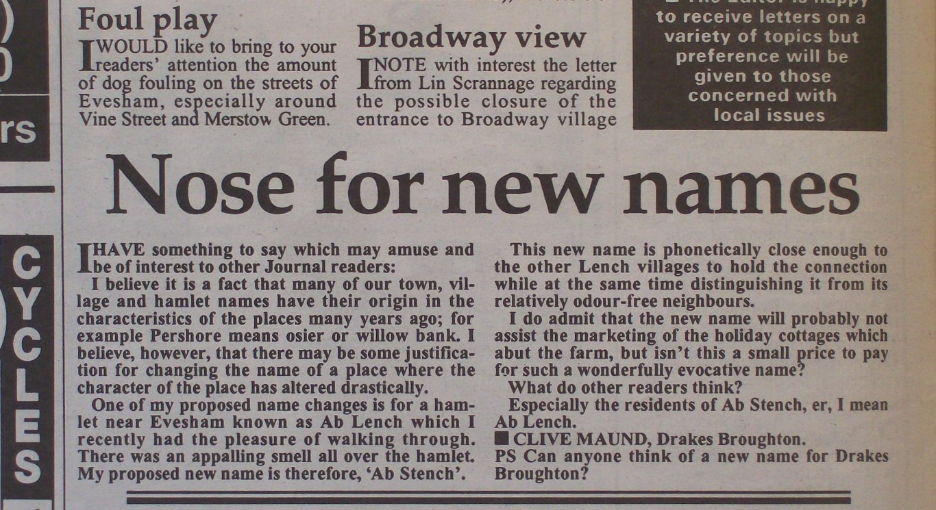 On a lighter note, if this is possible, and a complete change of subject, one day I was out on a country walk in Worcestershire with my sister-in-law and we strolled through the Lench villages (Ab Lench, Atch Lench, Church Lench, Rous Lench and Sheriffs Lench). One of these villages, Ab Lench, was small and little more than a hamlet which was distinguished by having a large filthy cattle shed in the middle of it with the poor beasts standing knee deep in excrement and mud outside it, kind of like you see in western Kansas (bring back the bison). Needless to say this generated an appalling smell over the entire settlement, and later, thinking about this, it occurred to me that a more apt name for this Hamlet would be as I suggested in this letter to the local paper…