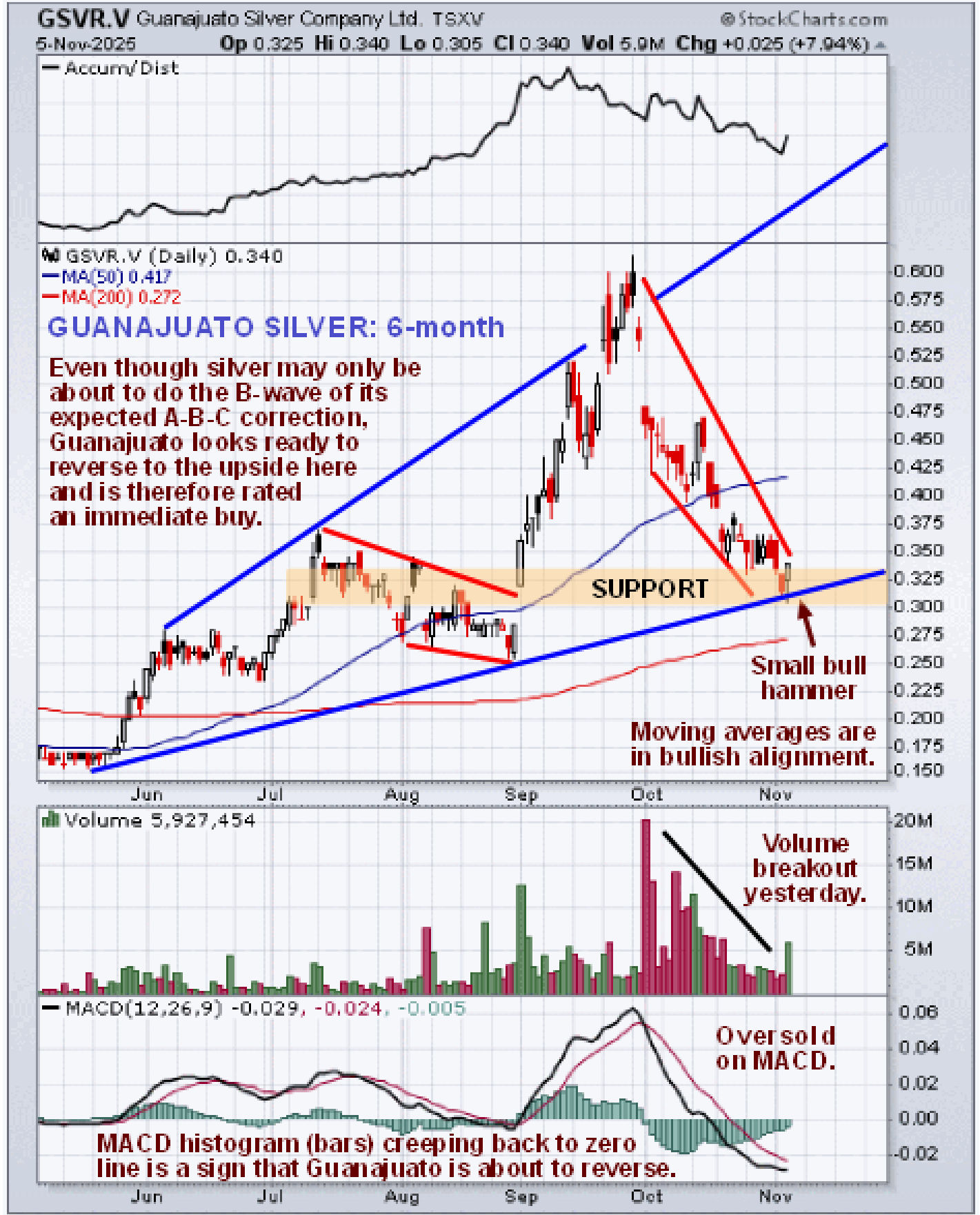 Even though we are aware that a silver advance now may only be the B-wave of the expected 3-wave A-B-C correction in gold, silver and PM stocks, Guanajuato Silver looks like it has seen its worst and like it is a buy here for reasons that can be seen on its latest 6-month chart below. On this chart we can see that it has dropped back to a support level near to the lower boundary of the large broadening channel shown where it is oversold and with its MACD histogram (bars) creeping back to the zero line, it looks ripe for a rally, which is believed to be being signaled by the clear volume breakout yesterday when a smallish bull hammer candle formed.