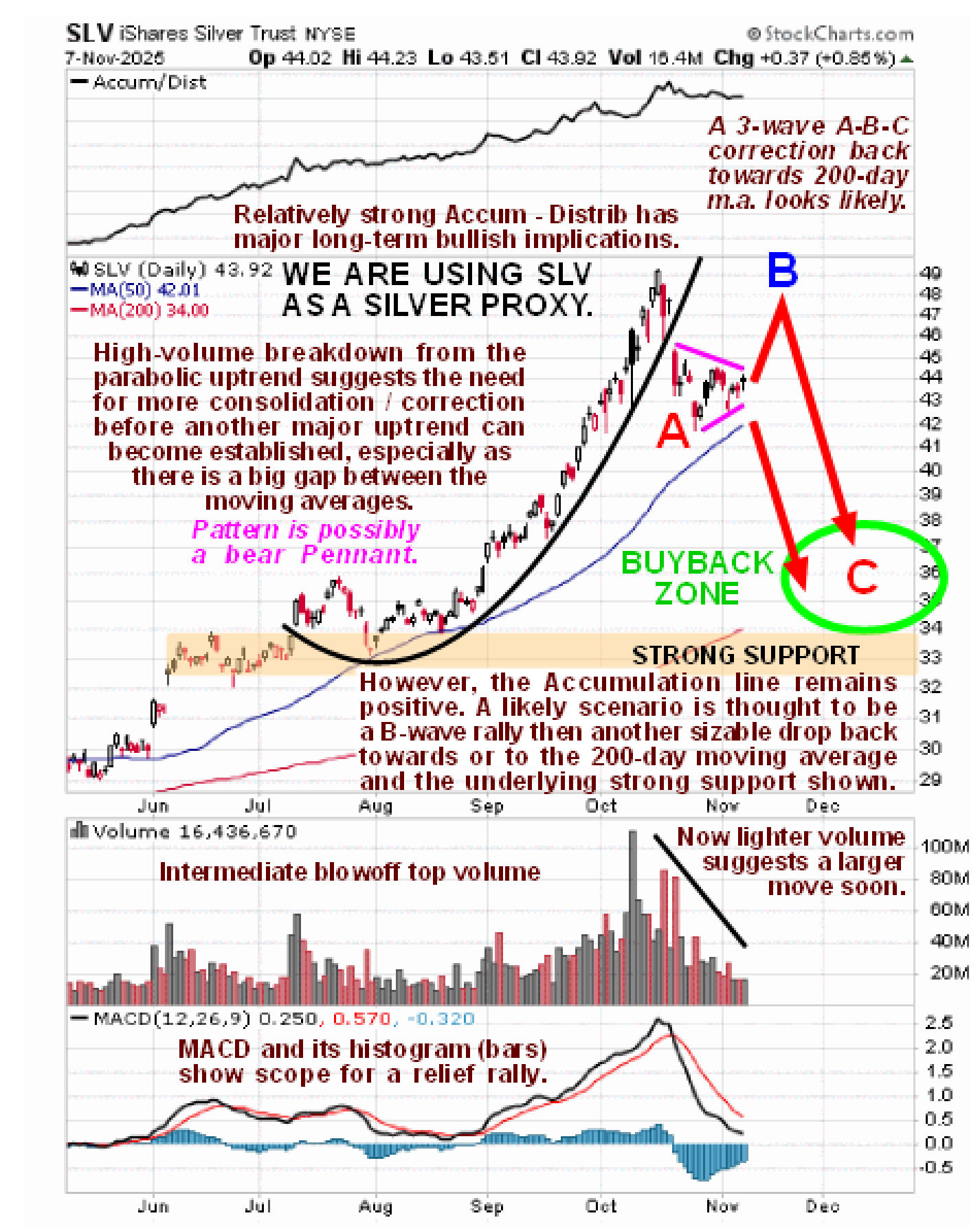 We’ll start by making the point that this correction is not believed to be over yet. There are several reasons for this opinion. One is that, as we can see on the 6-month chart for SLV above, it has broken down from a steep parabolic uptrend with volume having become very heavy around the peak, indicating that this was a “blowoff top” which normally means that a quite lengthy period of consolidation / reaction is needed to rebalance sentiment – and we haven’t seen much so far. The breakdown also involved a collapse in upside momentum (MACD) implying that for now the trend is down. Another factor pointing to the need for further correction is the large gap that has opened up between the 50 and 200-day moving averages. Although moving averages are definitely in bullish alignment, which bodes well for the longer-term, the current rate of climb of the 50-day is steep and further correction will serve to moderate this rate of climb. A complicating factor in deciding what will happen next is that the Accumulation line has held up well on the correction thus far which means two things, one is that the long-term outlook remains highly favorable as we have earlier observed, but the other is that the triangular congestion pattern that has formed over the past two weeks could be a small base pattern that leads to renewed advance at least temporarily, although as pointed out above, it is thought to be too soon for a major new uptrend to begin. These deductions lead us to the conclusion that the two most probable scenarios are that we see a B-wave “sucker rally” as shown on the chart that is followed by another quite severe downleg back towards the rising 200-day moving average and the strong support not far beneath it – if this happens we will probably turn a nice little profit on the stocks we have bought over the past week or so which we might dump on the B-wave peak with an eye to buying them back again later and the other scenario is that the triangular pattern that has formed over the past two weeks is a bear Pennant, despite the Accumulation holding up, that will lead to the sector breaking sharply lower again soon.