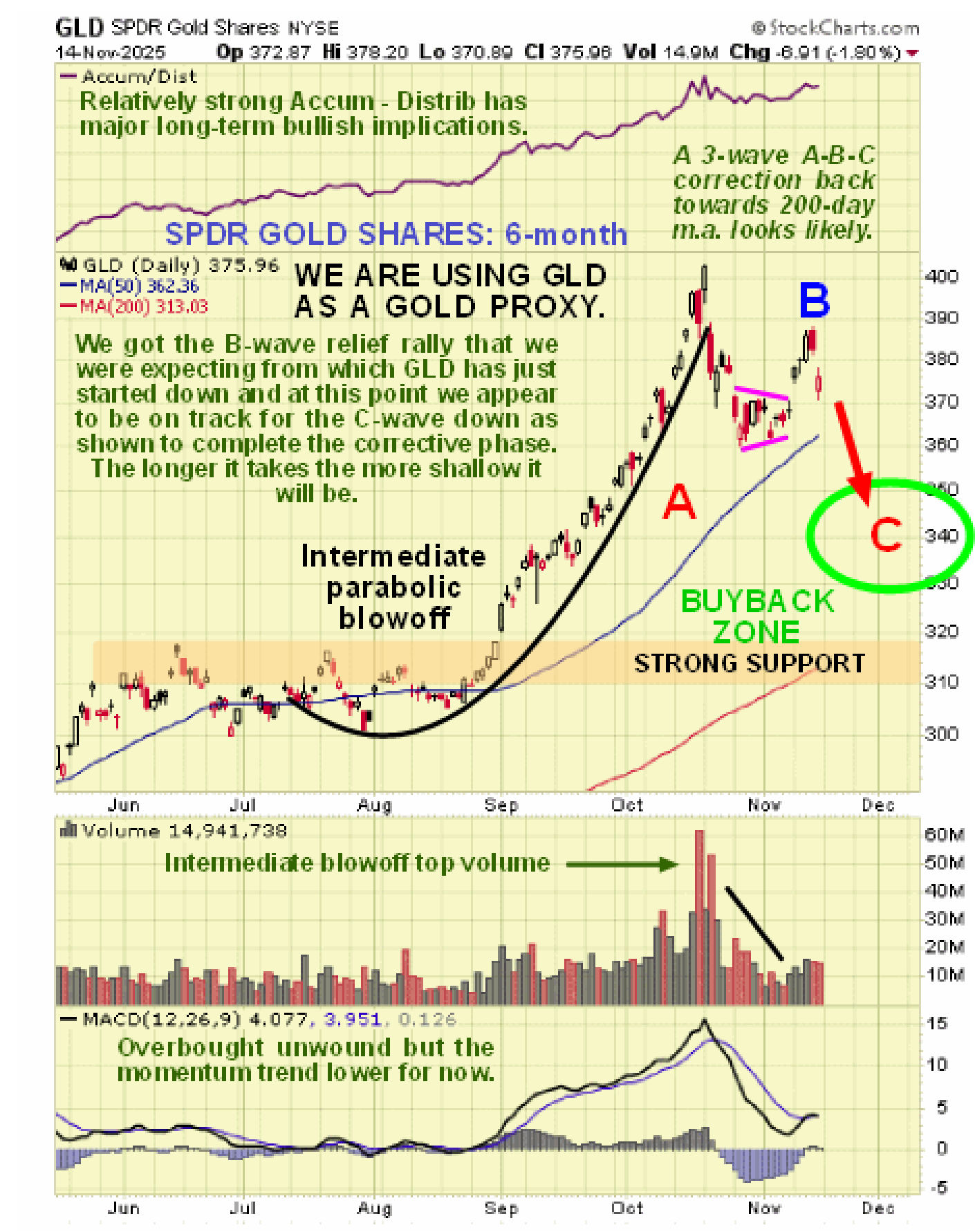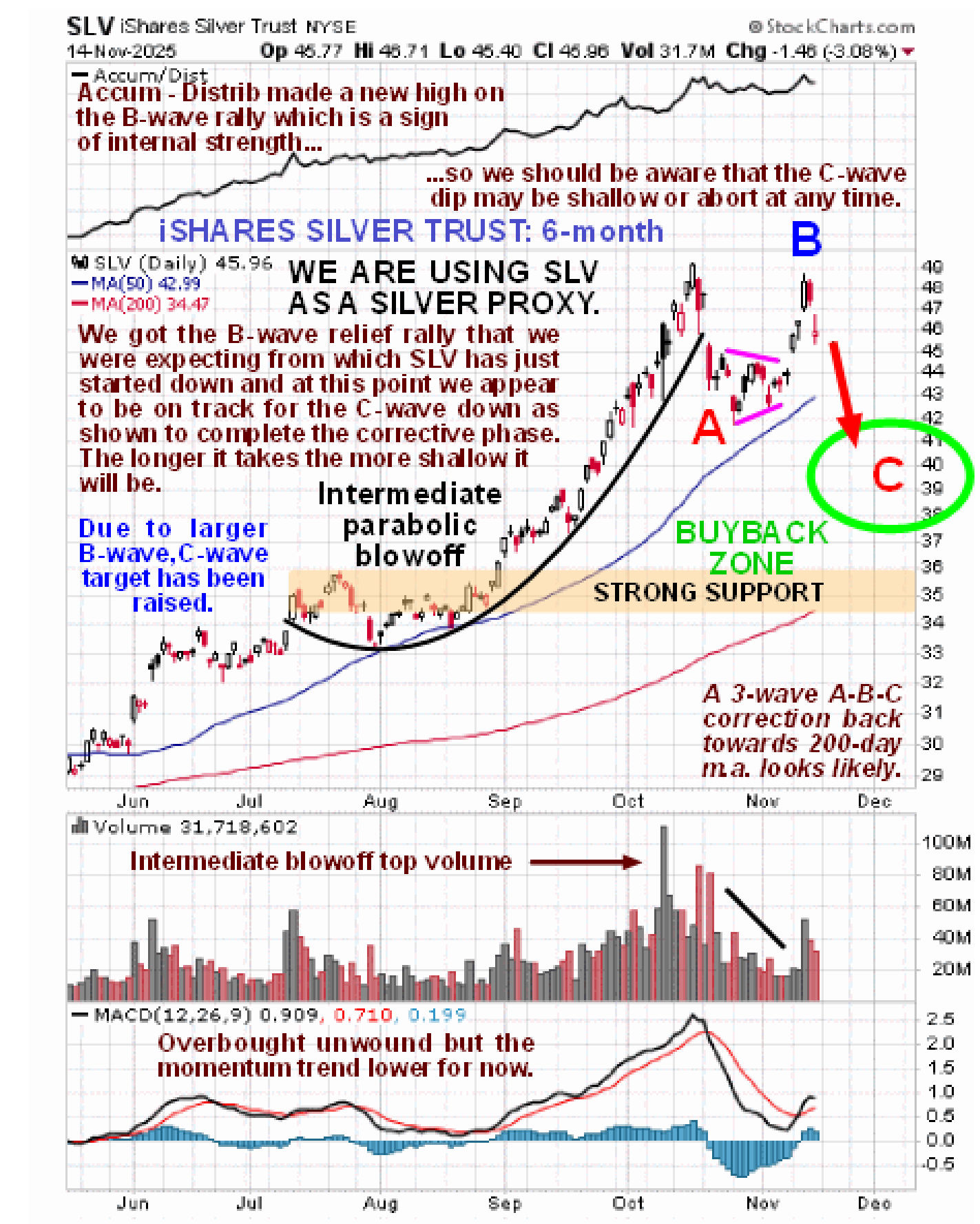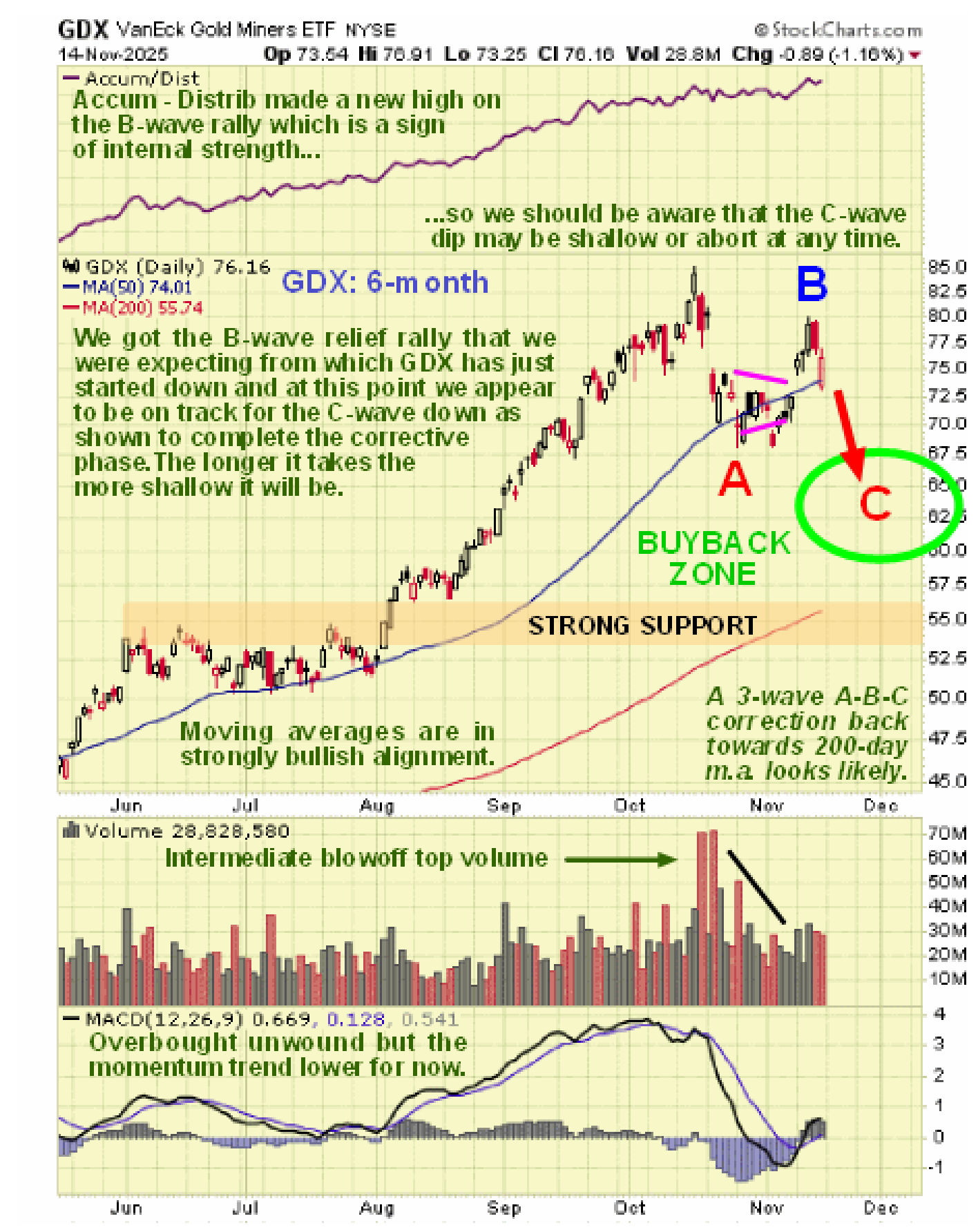 PM SECTOR CORRECTION ROADMAP with SLV dropping back to $42.5 early this month as predicted before the expected B-wave countertrend rally started. However, the B-wave rally was somewhat larger than expected and the Accumulation lines of GLD, GDX and SLV have all shown strength relative to price, making new highs in the case of GDX and SLV, which is viewed as a bullish divergence which suggests that the C-wave of the corrective phase, which started on Thursday, will probably be shallower than we earlier expected and could abort at any time, which we need to bear in mind. This is why we are “putting our best foot forward” and buying some stronger stocks even during the corrective phase. Here is the chart from the November 9th