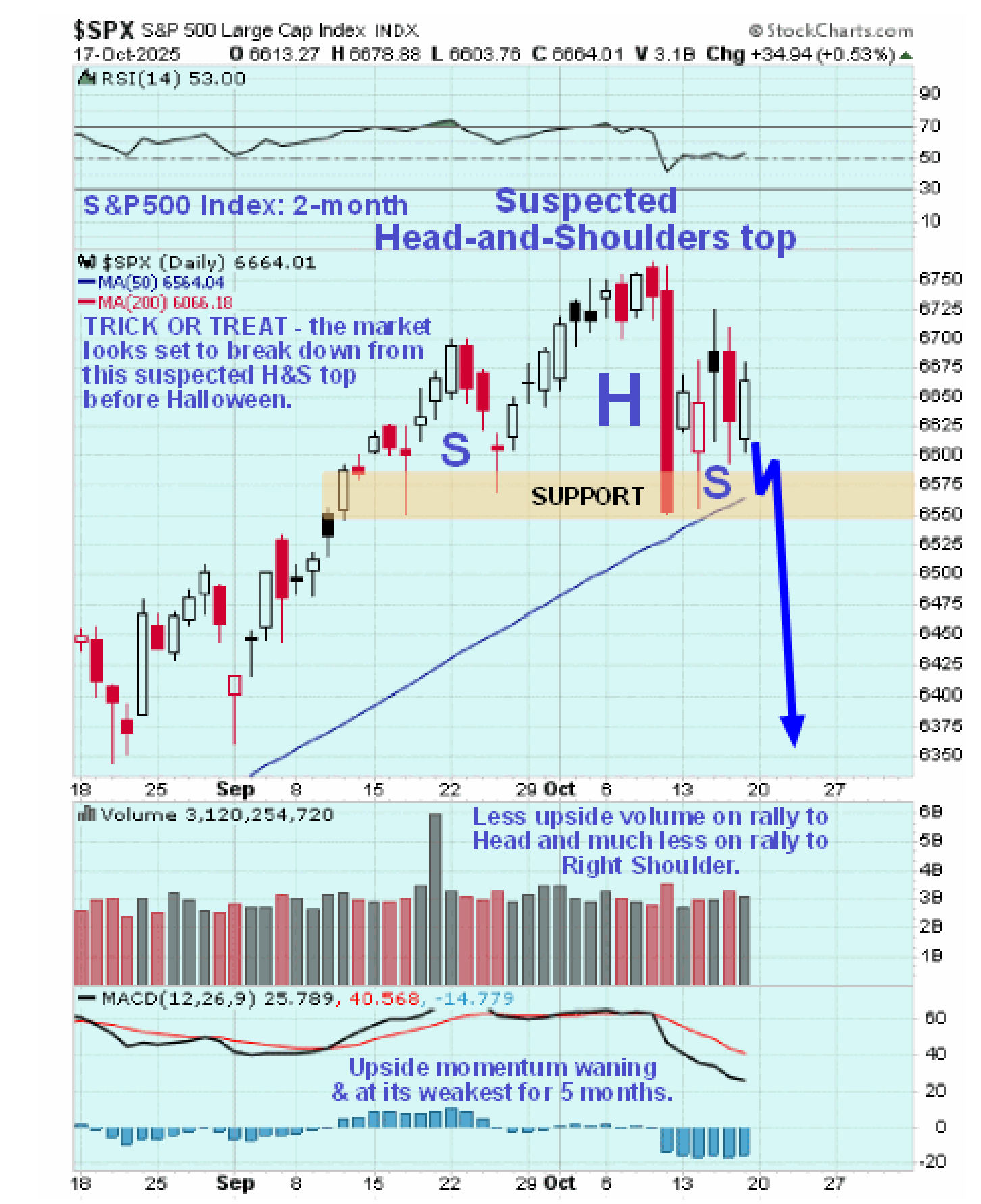 We have ridden the uptrend in the Precious Metals sector for all its worth over the past several months, generally making substantial gains but after breaking higher yet again last week it suddenly reversed dramatically on Friday in a manner which suggests that significant correction is probably starting that will be of a sufficient magnitude to be worth sidestepping – and this is especially the case because the broad stock market looks like it is now in position to drop hard or even crash and take the PM sector with it into a heavy correction. This being the case, we will starting by reviewing the latest charts for the S&P500 index.