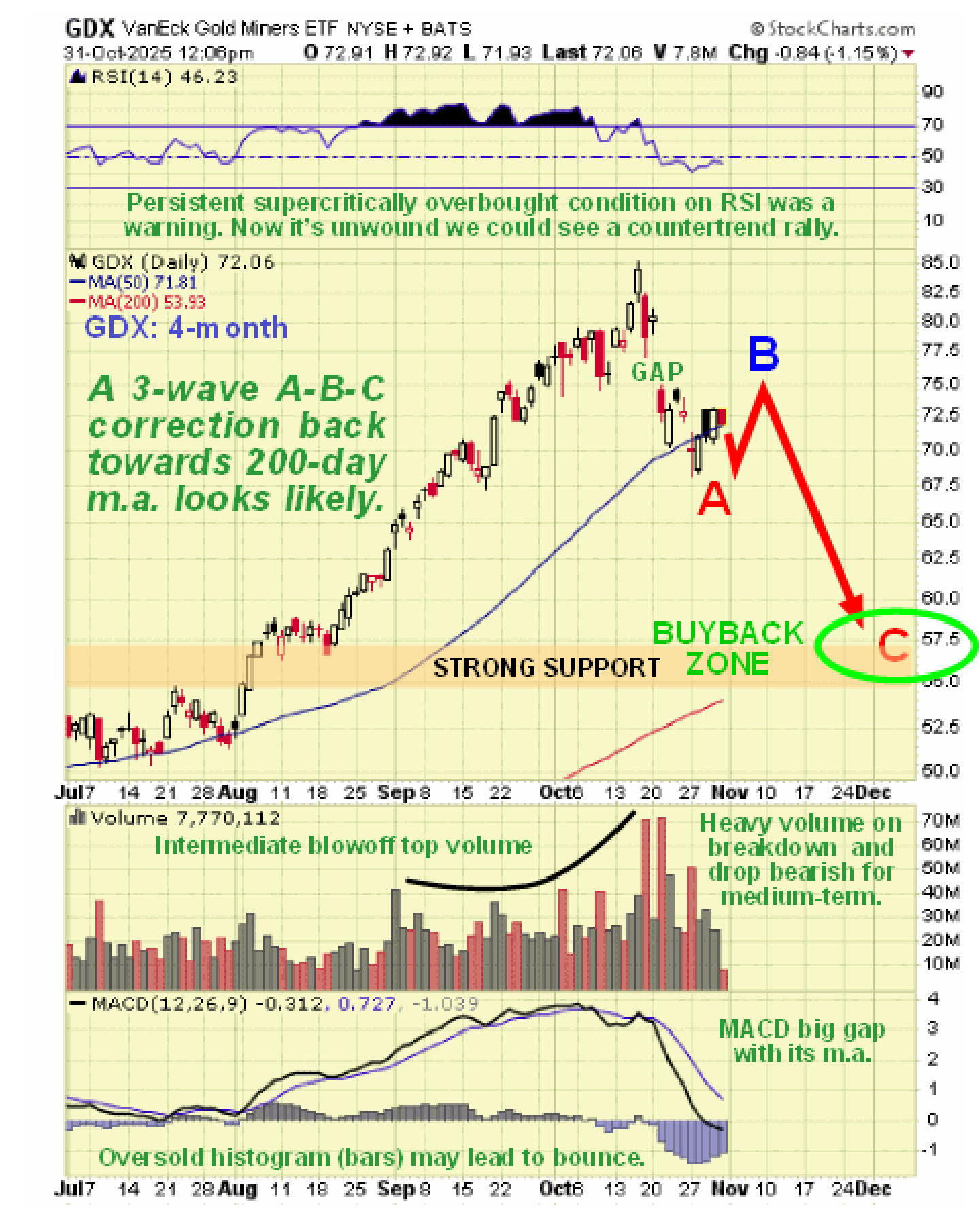 - The rate of climb of moving averages has become very steep with a yawning gap opening up between the 50-day and 200-day moving averages that calls for further corrective action going forward – the sector is currently finding support in the vicinity of the rising 50-day moving average on all these charts and this support may generate a B-wave “sucker” rally as shown on the charts but because of the large gap between the 50 and 200-day moving averages, this support is expected to crack leading to further corrective action back towards the 200-day.