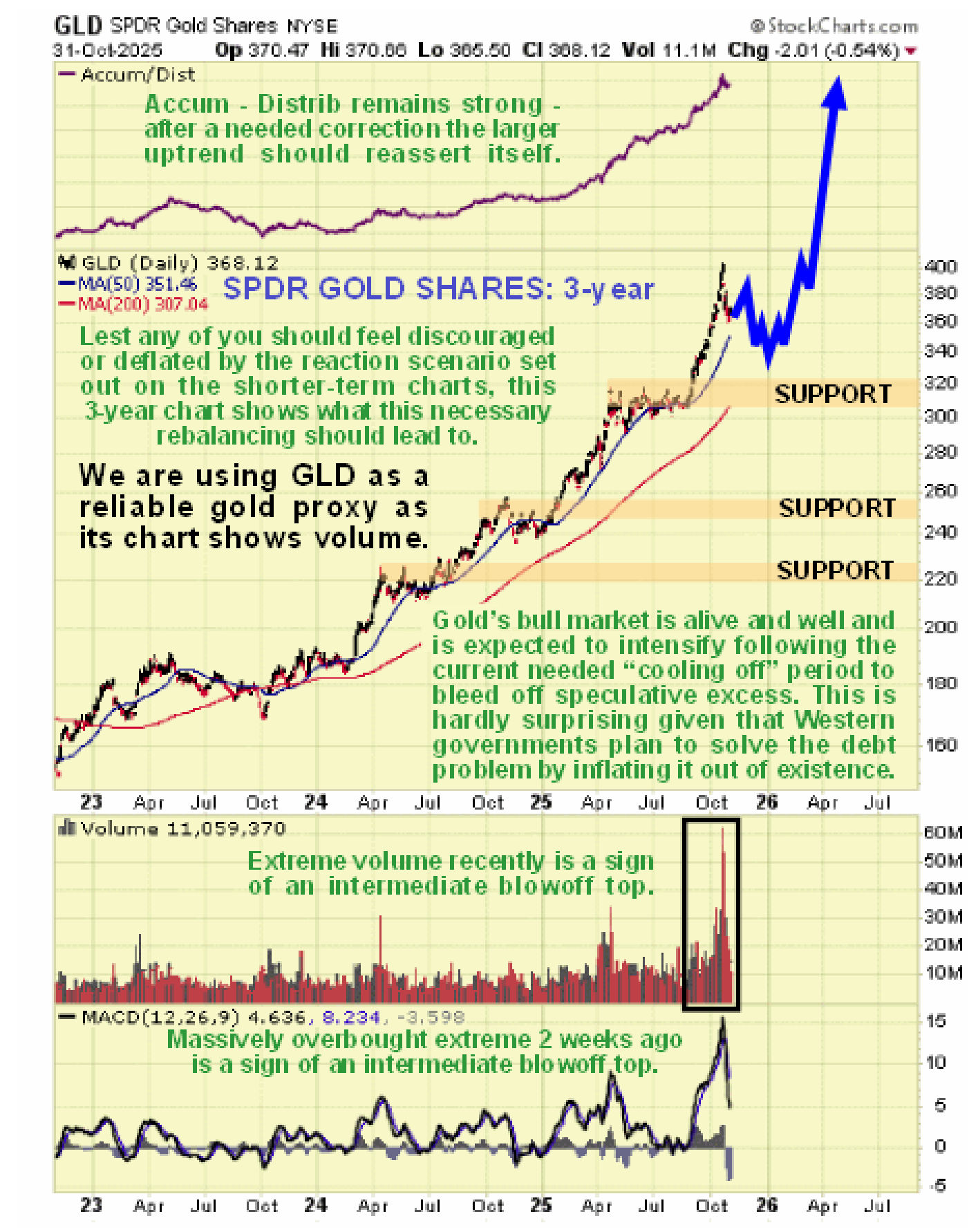 Lest any of you should feel deflated or discouraged by the seemingly somewhat negative short to medium-term outlook shown on the shorter-term charts above, the following 3-year chart makes clear that GLD’s bull market, and thus gold’s, is alive and well and should resume in earnest once the necessary rebalancing of sentiment resulting from the current phase of consolidation / correction has run its course…