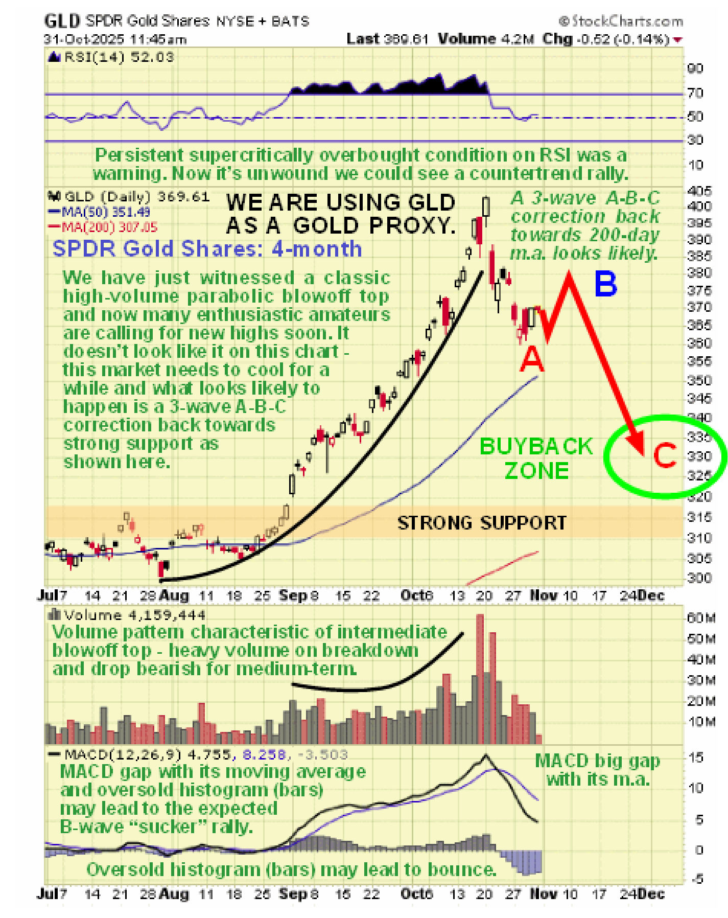 - Both gold and silver broke down from a parabolic blowoff top on Tuesday 21st October, as shown on the charts of their faithful proxies GLD and SLV, below. A breakdown from a top of this nature invariably leads to a long period of consolidation / correction – it is almost unheard of for new highs to follow soon after a breakdown from a top of this nature.
