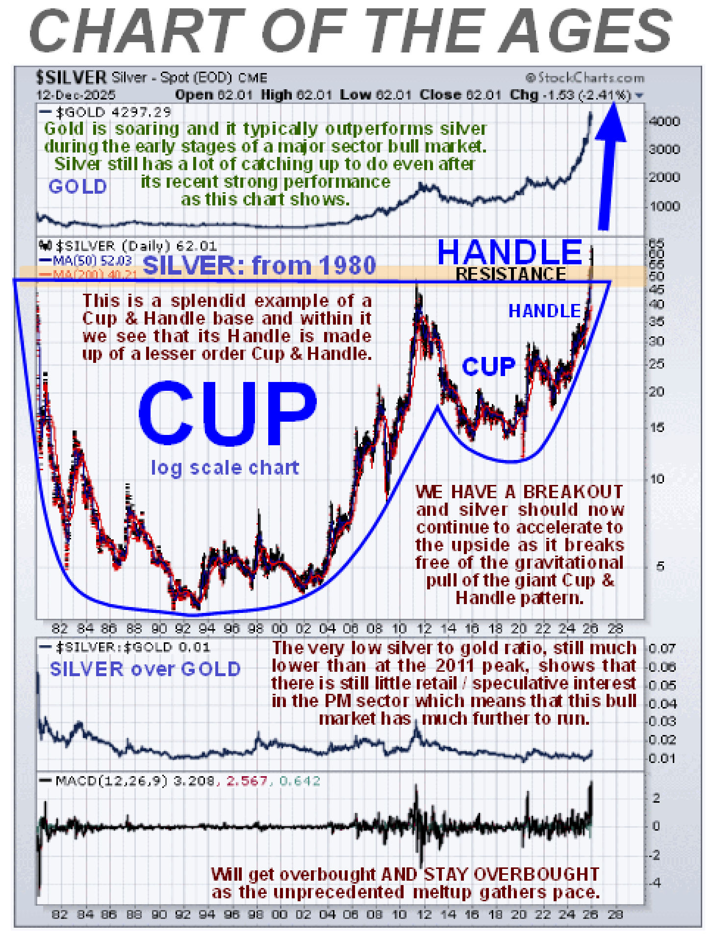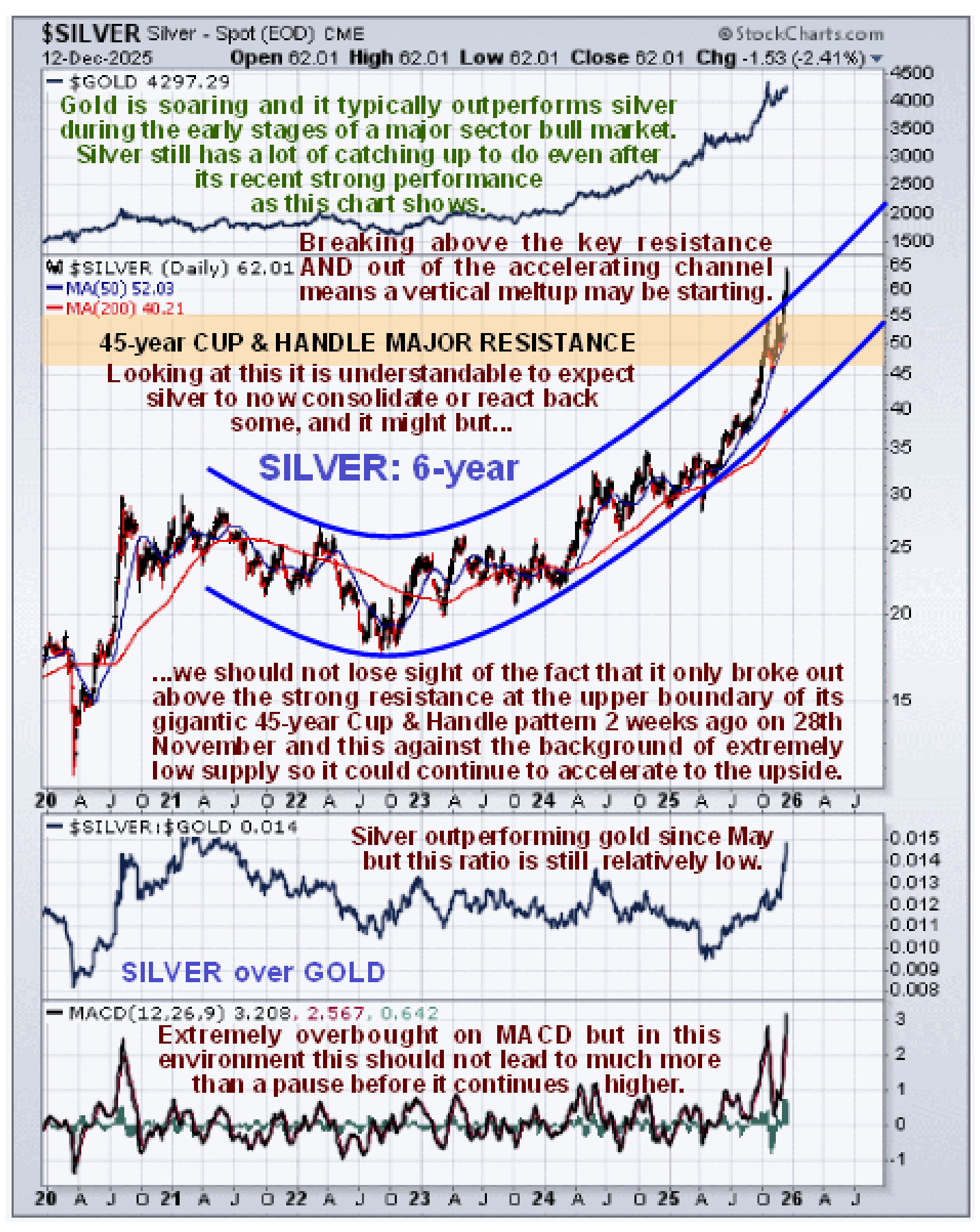 It’s worth reviewing recent action in detail on a 4-month chart. You may recall that we had thought that a corrective C-wave down to a point near to or below the late October low was likely. The setup is so strong that it didn’t happen, so we swiftly revised our thinking in light of developments and is now clear that the stunted C-wave that did occur which found support above the rising 50-day moving average and well above the late October low served to create the “Handle” of a small Cup & Handle continuation pattern with the entire consolidation pattern from the mid-October peak also being a bullish Ascending Triangle that led to the momentous breakout on 28th November, a day that should go down in the history books as one of the greatest days in the history of the silver market, if not the greatest day. Following the breakout a small bull Flag formed early this month which led to another upleg that has resulted in a very overbought condition. While it may take a little rest here, conditions are now perfect for a total meltup to occur in silver where it continues to advance steeply to higher and higher levels, overbought or not. In this environment silver stocks that have been “dragging their feet” lately, such as Aftermath Silver (AAG.V) and Couer Mining, CDE, should get their act together and take off strongly higher.