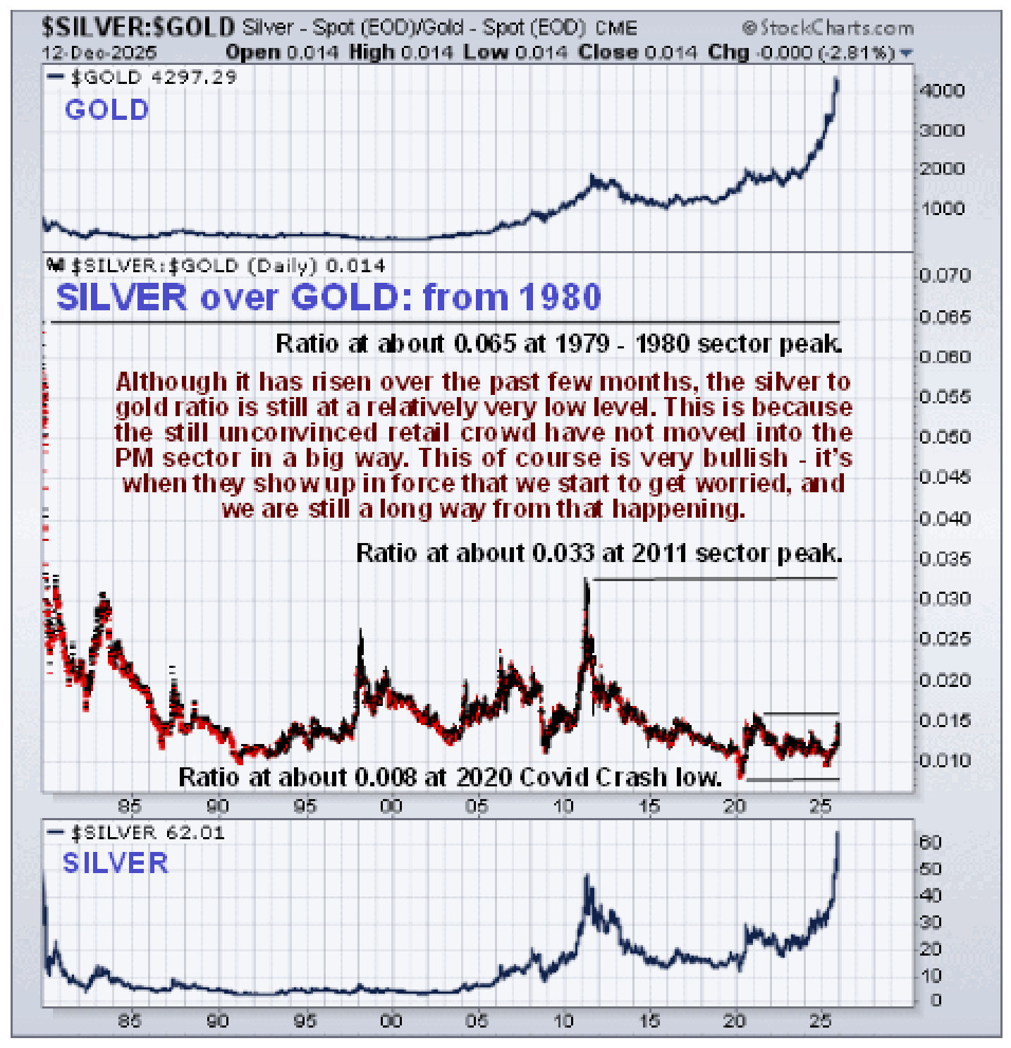 Lastly, the long-term silver over gold ratio chart also going back to 1980 makes clear that the retail crowd are still not involved in the Precious Metals market for when they are this ratio is at a much higher level. Although the ratio has risen in recent months it is still at a relatively very low level. The rationale behind this is that when the retail crowd get involved they favor silver over gold because of its leverage. The still low level shows that this bull market is remains in its earlier stages with much more upside ahead of it.