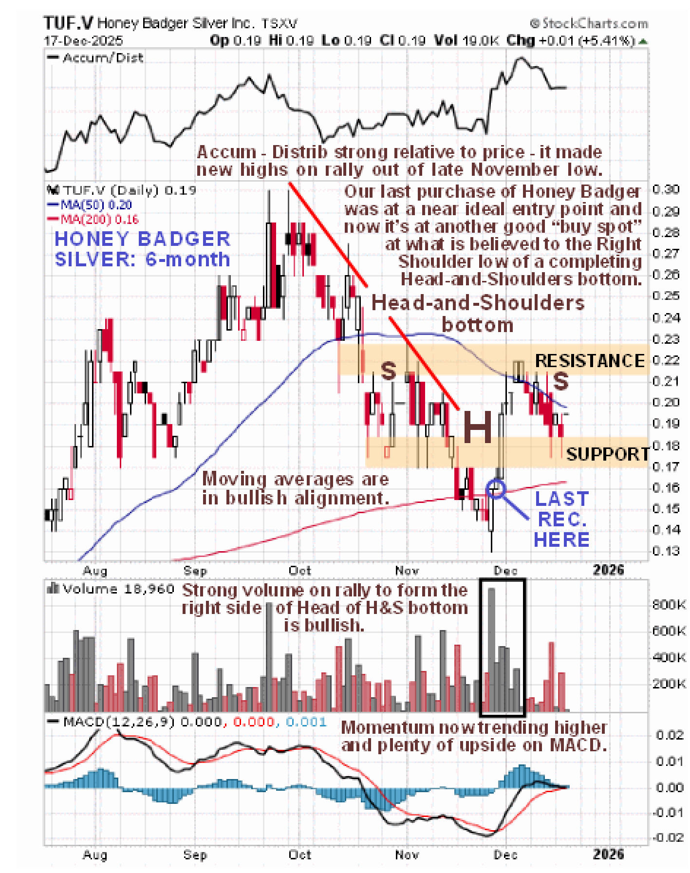 We have been accumulating Honey Badger Silver on and off since the middle of Summer. The first point at which we bought late in July was good, as was the purchase late last month. The purchase in September was not so good and we are showing a loss on it – the bull Flag spotted at that time did lead to a sharp move higher but then it reversed into a corrective downtrend that continued until late last month. With all that said, the good news is that it is shaping up well and we can can see on the latest 6-month chart below that when we bought late last month we managed to catch almost the exact low of what can now clearly be seen to be a completing Head-and-Shoulders bottom, having spotted a large bullish White candle that formed on heavy volume marking a bottom reversal. The rally out of this low on persistent strong volume to form the right side of the Head of the pattern is most auspicious.