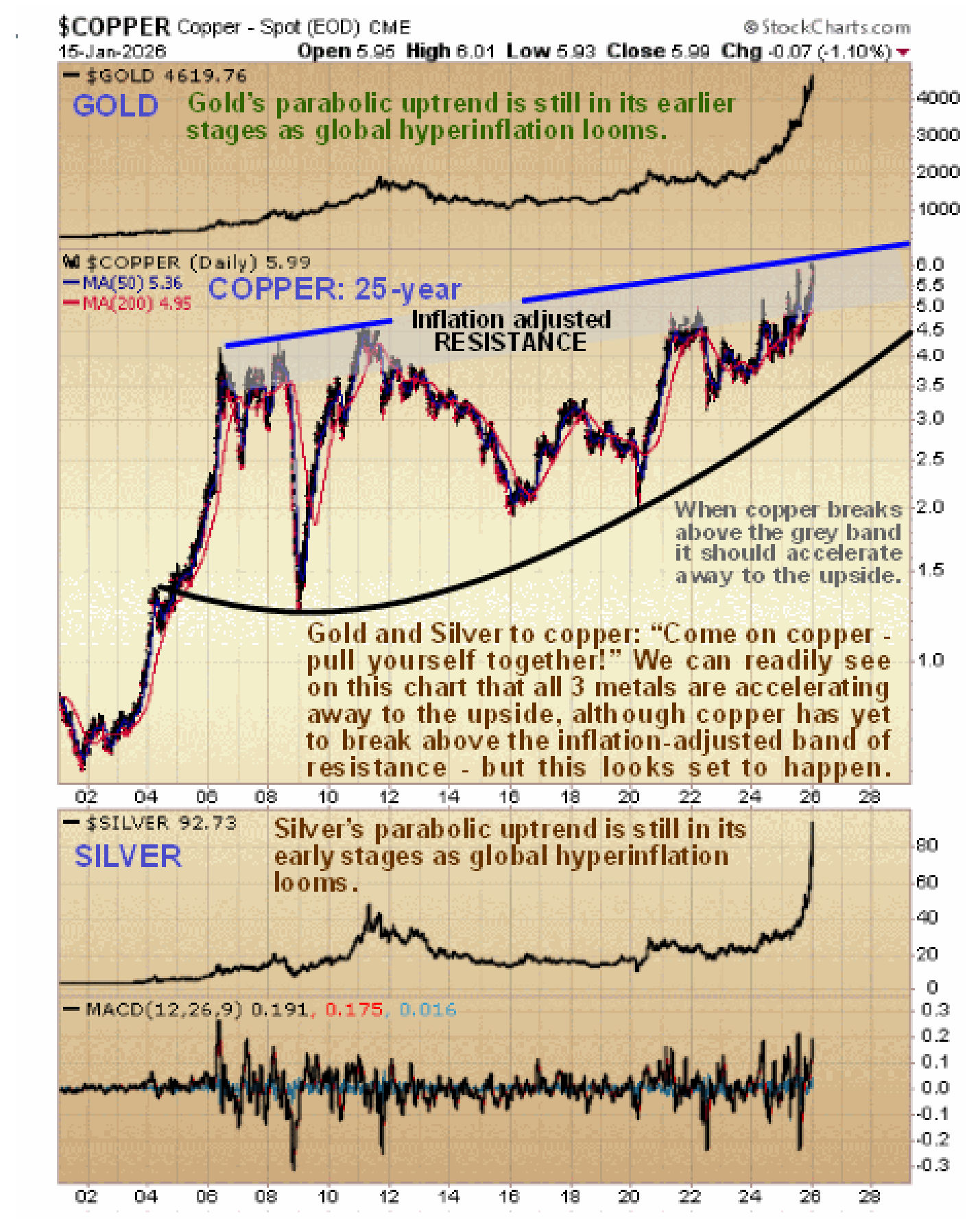 Instead, on its somewhat shorter-term 25-year chart, we see that copper is being shepherded higher by a rising parabolic trendline that is driving it towards what will be a key breakout above an upsloping band of resistance dating back to 2006, which would be flat if we factor in inflation during this period or even downsloping. Once it breaks above this trendline it is expected to join the other metals in accelerating away to the upside and copper (and various copper stocks) therefore looks like a standout investment at this time.