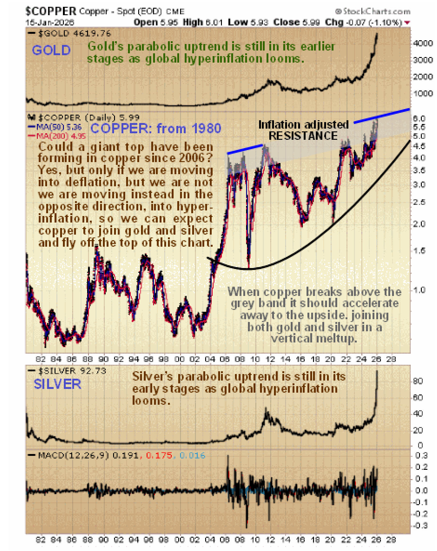 In terms of not having made its move yet, copper is “the star of the show” at this time. Superficially on its 45-year chart it looks like it might have been marking out a gigantic top pattern from its 2006 peak, but this is hardly likely to be the case with a deflationary bust seemingly “off the table” as gold and silver go parabolic with hyperinflation looming.