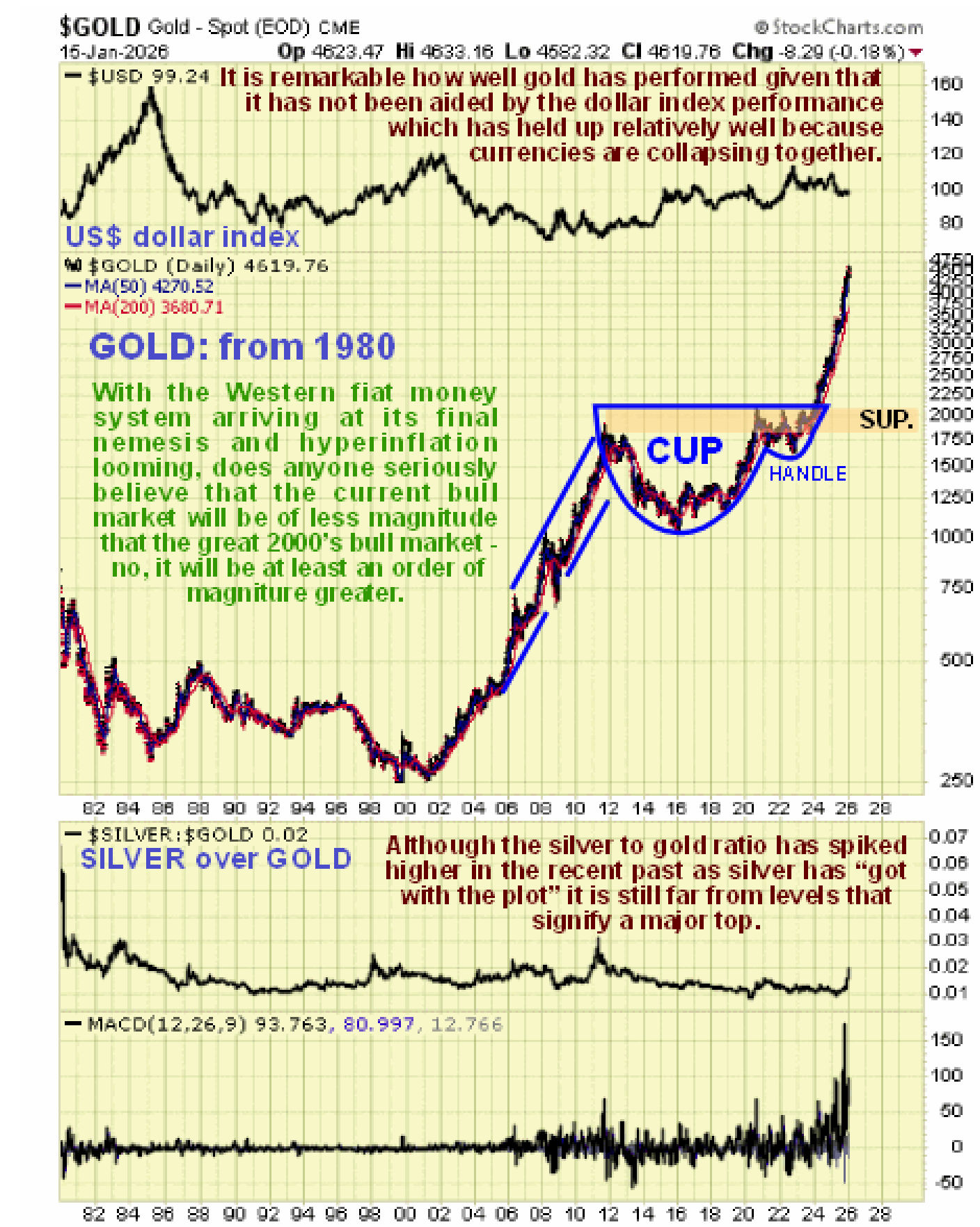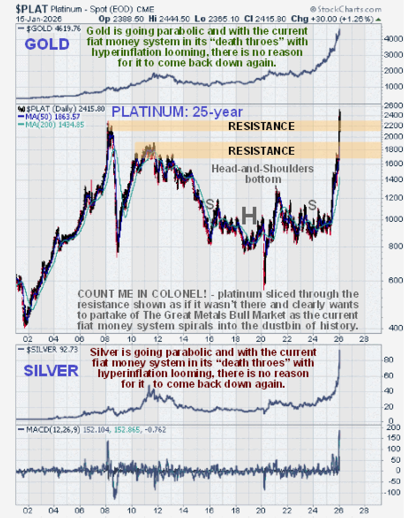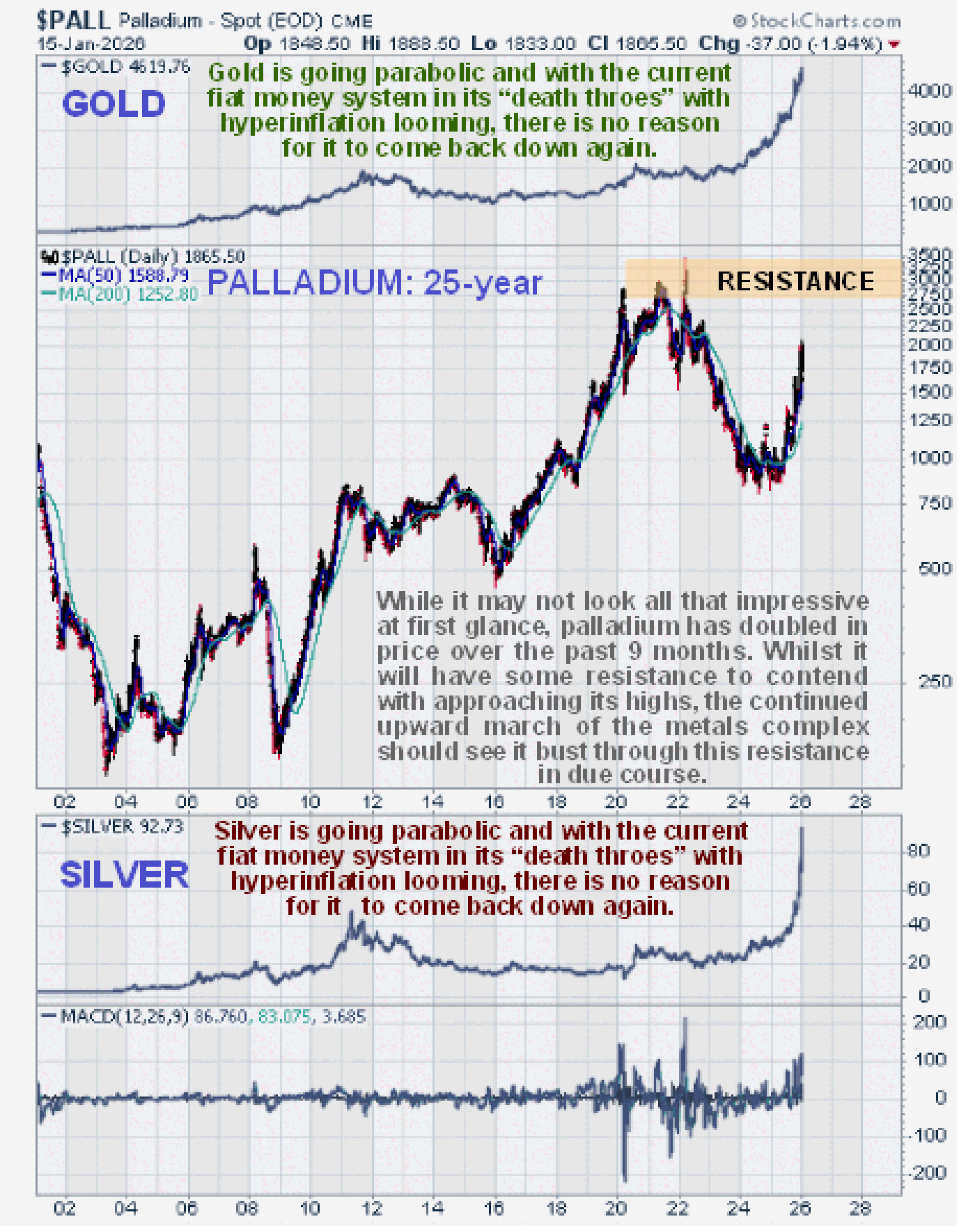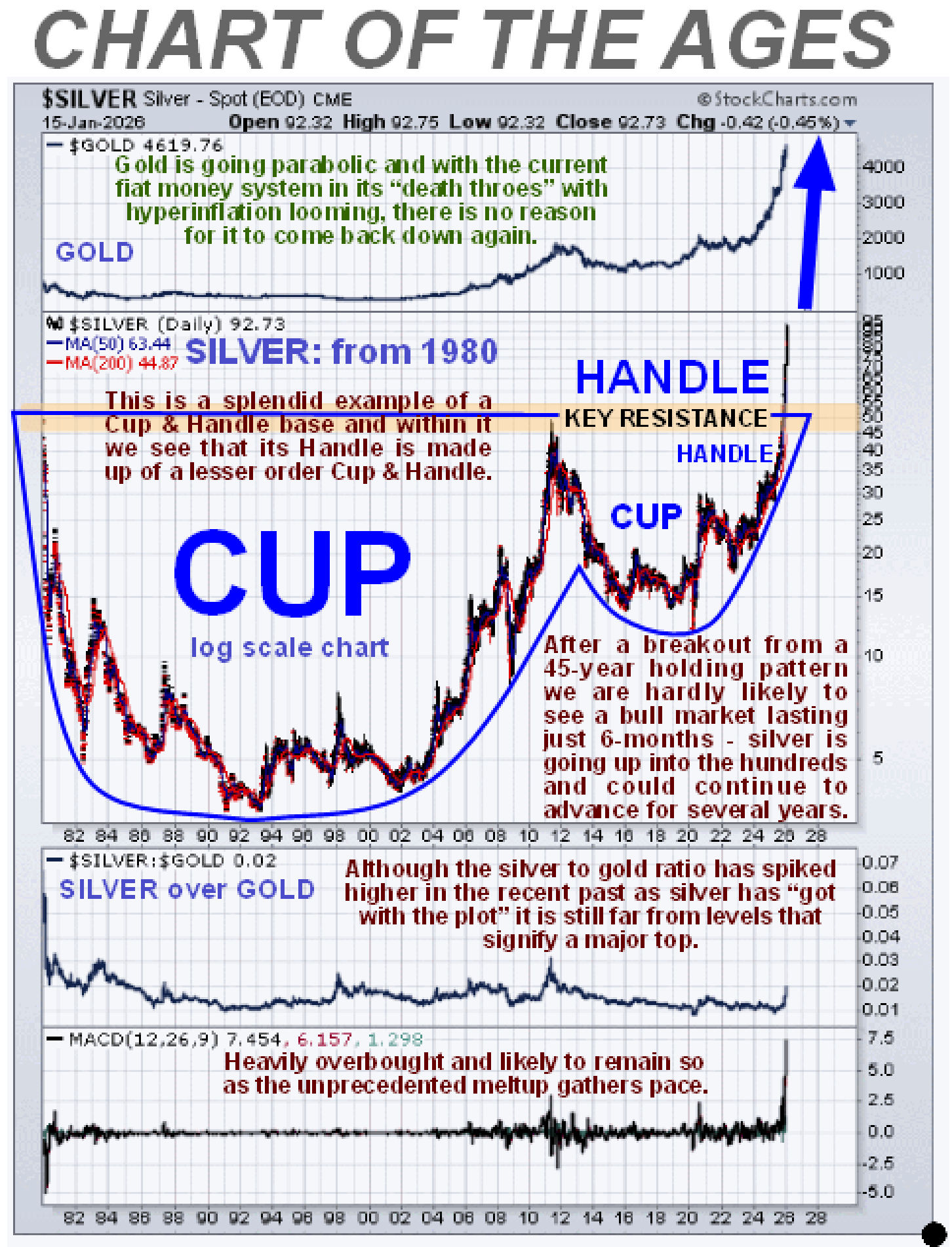 Silver has done exactly what was expected of it all along, except that it has not corrected back at all. Having broken out of its giant 45-year long Cup & Handle pattern it has now not surprisingly entered meltup mode, and the key point to make here is that, having taken 45-years to build up to this, the show is hardly likely to be over in 6-months – no, this bull market will probably last several years and take the silver price to levels that few can currently imagine. It’s the best investment of all at this time. Although massively overbought on its MACD indicator it is unlikely to do much more than consolidate occasionally and any weakness should be bought – the powerful uptrend is expected to continue.