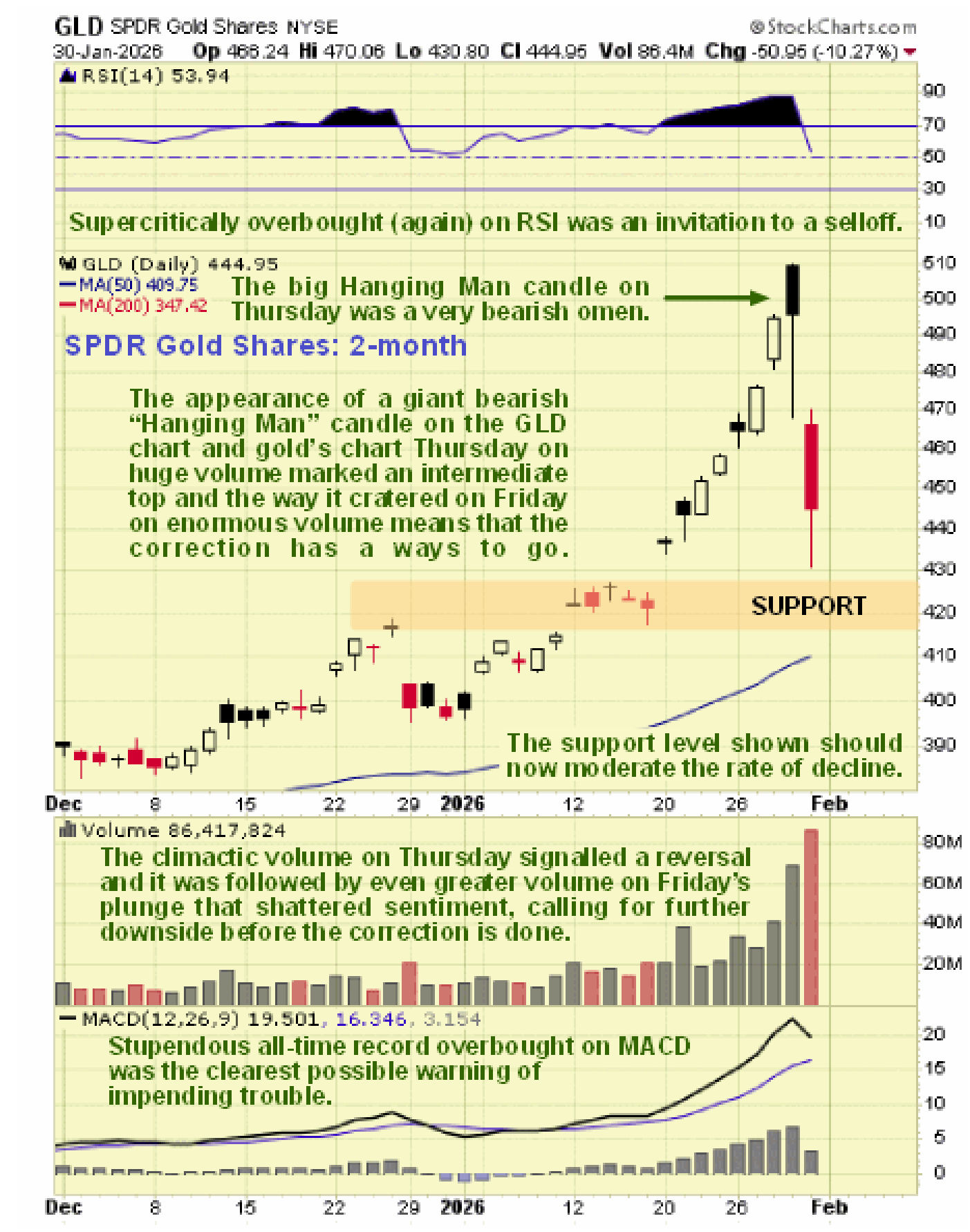 We can see on the following 2-month charts for gold proxy GLD and silver proxy SLV how they both flashed warning signs that they were topping out last week as in addition to becoming enormously overbought with volume rising to huge levels, they both put in prominent bearish candlesticks with GLD making a massive “Hanging Man” candle on Thursday and SLV making a bearish “Gravestone Doji” / “Shooting Star” last Monday followed by a bearish “Hanging Man” candle on Thursday. These meant big trouble and that’s what manifested on Friday when both gold and silver cratered. We saw this coming earlier last week which was why an article was posted entitled Are we seeing AN INTERMEDIATE BLOWOFF TOP in silver stocks?