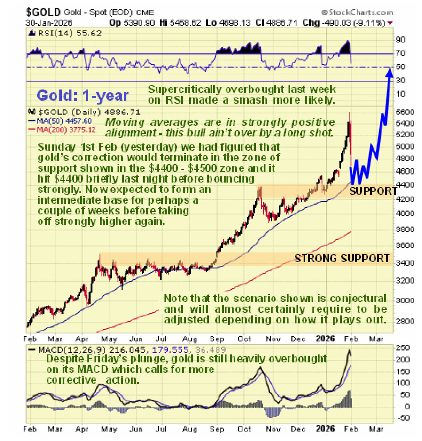 If you want to know when to buy gold and gold stocks, it will probably also be when silver gets close to its parabola, since gold and silver are likely to bottom at pretty much the same time and it is considered likely that gold will bottom in the zone of strong support in the $4400 - $4500 zone shown on the following 1-year chart...
