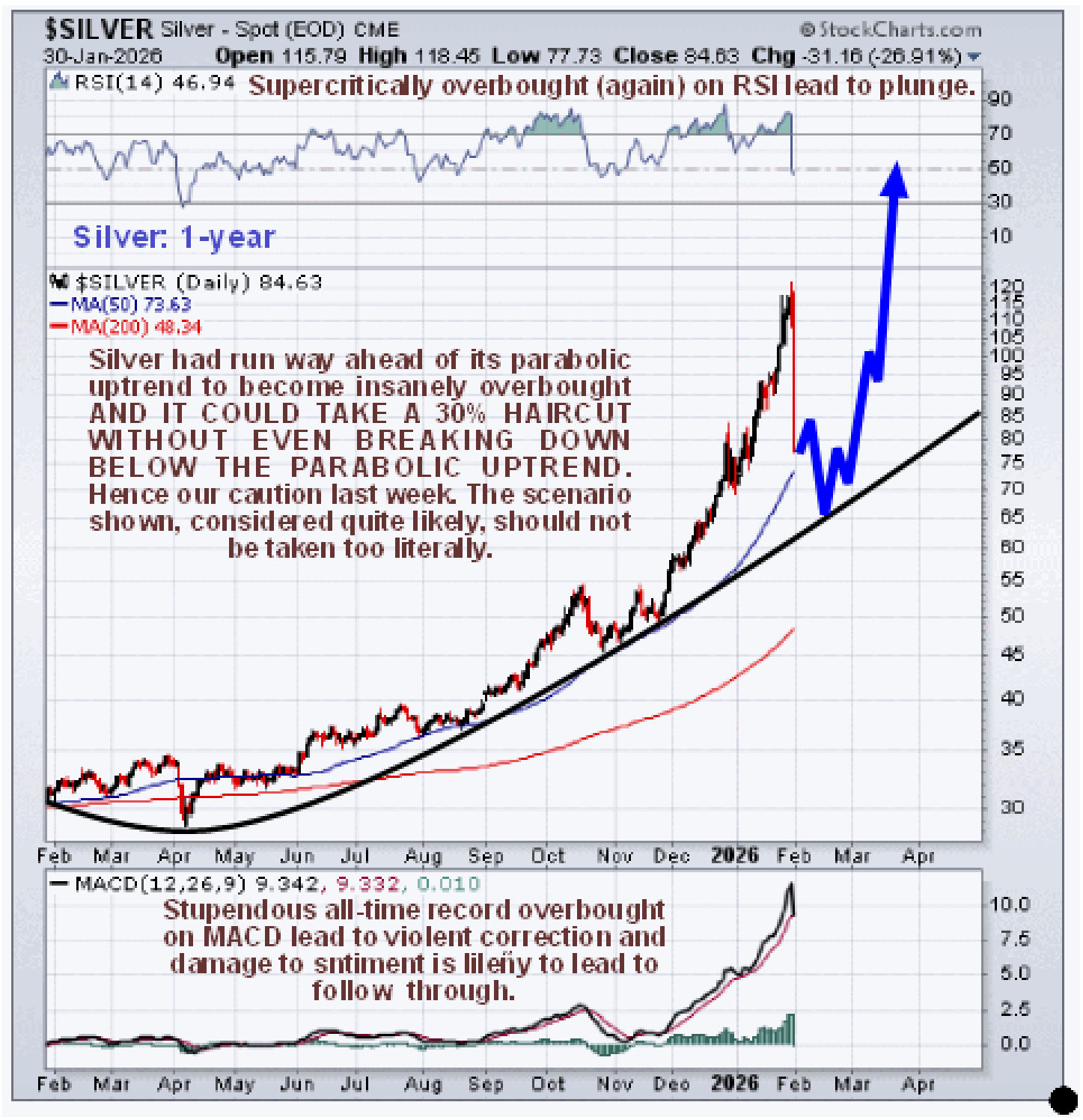 Just how insanely overbought SLV had become is made plain by the following 10-year chart for it where we see that it has gone vertical with the MACD indicator having flown repeatedly off the top of the chart setting record after record of overboughtness and it’s the same situation with silver itself. Many people said “It’s different this time” and it was – until it wasn’t.