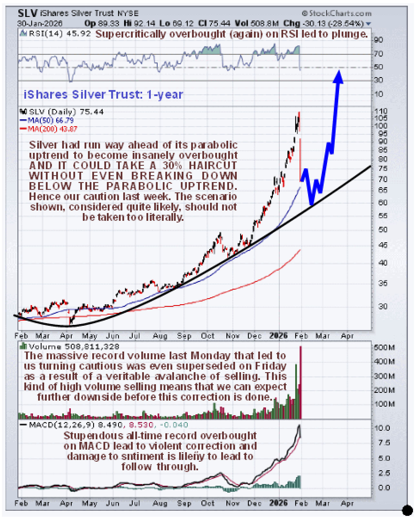 With silver (and SLV) what is expected to occur is a more measured decline probably lasting for about 2 weeks back towards the parabolic uptrends shown on their respective 1-year charts below, above which an intermediate base is then expected to form that will lead to renewed advance and the recovery is likely to be swift. Here it should be noted that the scenario depicted is conjecture on my part and will almost certainly require adjustment going forward, but at this juncture it is considered to be the most likely.