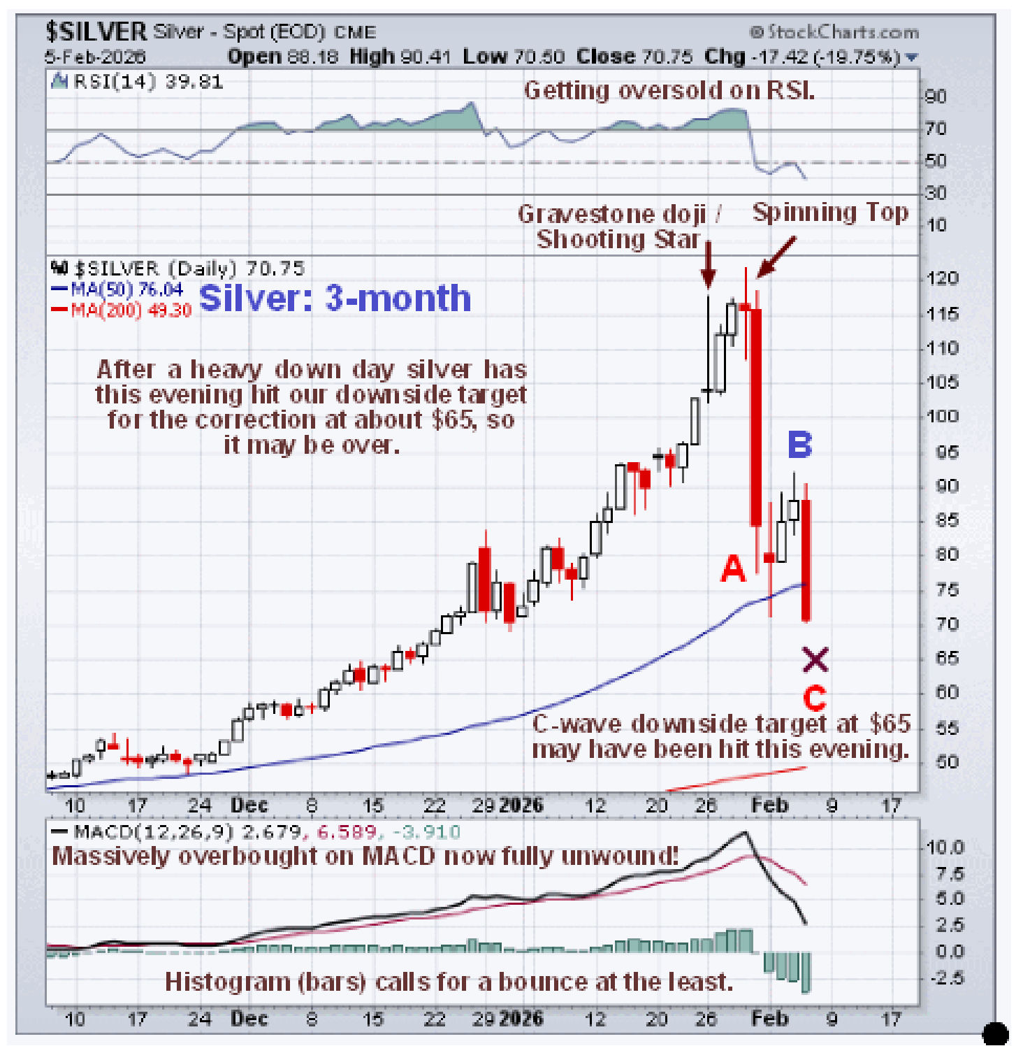 CORRECTION DOWNSIDE TARGETS FOR GOLD AND SILVER almost exactly and is now approaching our downside target for this correction at about $65 with further losses this evening compounding the heavy $17.40 loss today on the CME. Gold is holding up better, having briefly touched our downside target at $4400 intraday on Monday, which is due to strong underlying support at $4250 - $4400 that we had earlier noted. On the silver and SLV charts it looks like we are seeing the completing C-wave of a 3-wave A-B-C correction.