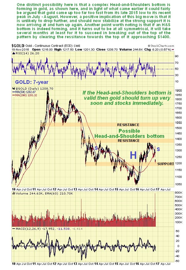 Charts only ever indicate probabilities, not certainties. At the time of the last update, gold was setting up for another upleg within the uptrend shown on our 1-year chart below, but this was predicated upon the expected Clinton victory, so when Trump won instead, this scenario aborted. Observe how, early on election night, when the markets assumed Clinton would win, gold was up sharply, but by the end of the night it had reversed sharply on heavy turnover, and it went on to break down from the uptrend and head steeply lower towards the important support level shown, which it started to arrive at on Friday. Fundamentally, the reason for gold heading sharply lower on a Trump win was not the possibility of Trump melting down Trump Tower and casting it into gold ingots to dump on the market, but the prospect of Trump’s ambitious and expansionary policies driving up interest rates which had the immediate effect of driving the dollar higher, but given that sharp moves across markets since the election have been based on a combination of assumptions and wishful thinking, they could go into reverse very quickly, and with the dollar hitting a target late last week, gold has a good chance of turning up from the support in the $1180 - $1210 zone. It is widely assumed that because Trump won the election by a clear majority (of electoral votes), he has “carte blanche” to fulfill his election pledges as he wishes, but there are powerful vested interests standing in his way who will make their presence felt, which is a reason some of the post-election trends may go into reverse